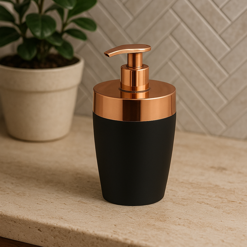 O Dispenser Porta Sabonete Liquido Preto com Rose Gold 16cm traz modernidade e praticidade para sua bancada, ajudando na organização e decoração.