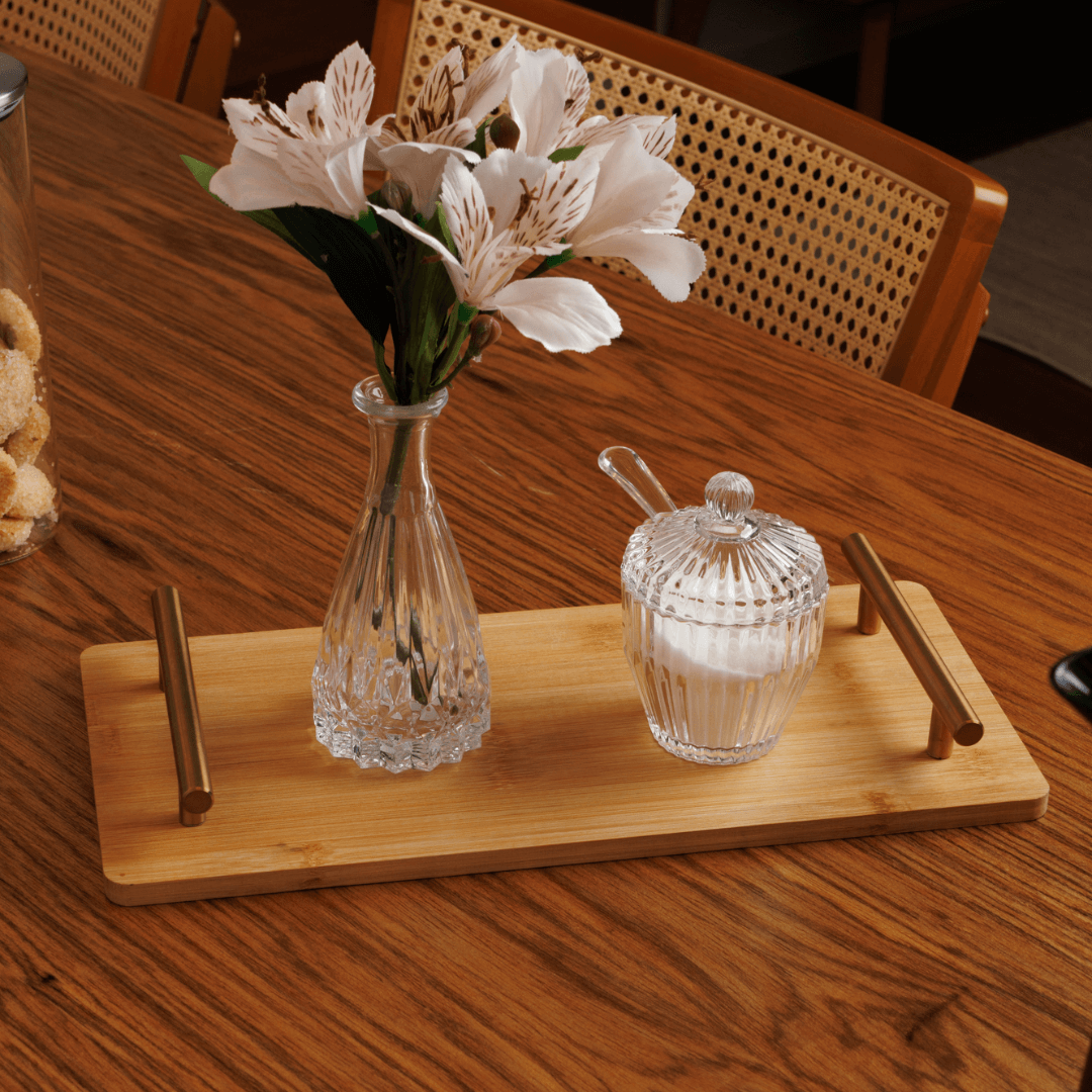 Produzida em madeira natural, transmite aconchego e sofisticação, enquanto as alças metálicas douradas adicionam um toque de luxo e praticidade ao servir.