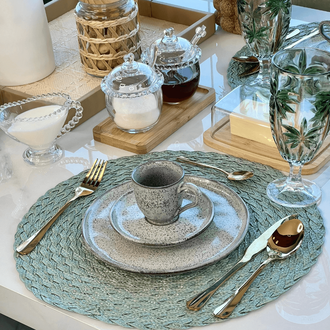 Desfrute de uma mesa mais elegante, sofisticada e organizada com o Jogo Americano Redondo Poliéster Leaf Oliva Verde 38cm.