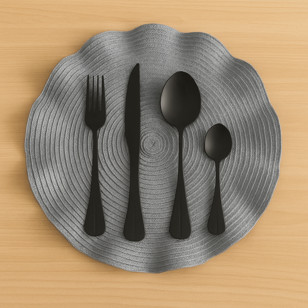 Leve sofisticação e harmonia à sua mesa posta com o Kit Faqueiro Ônix 24 Peças e 6 Jogos Americanos Prata.