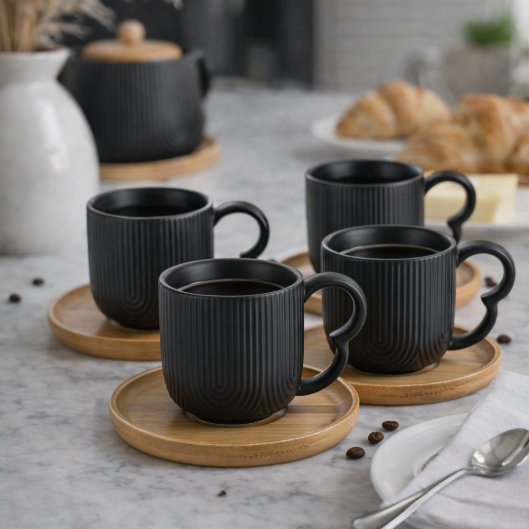 Com o tamanho ideal para um café expresso perfeito, este conjunto traz a sobriedade do preto fosco aliada à resistência da cerâmica premium.
