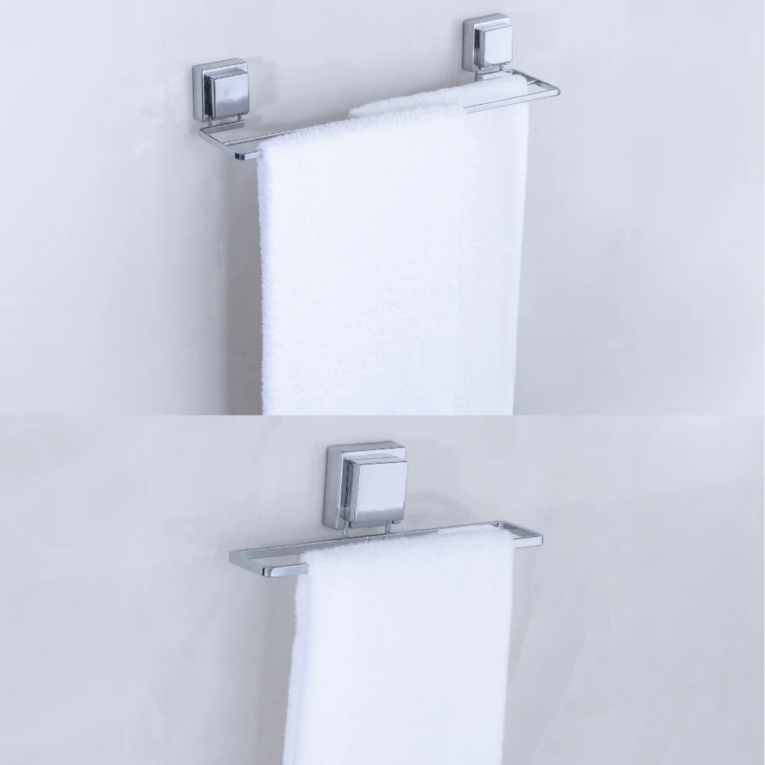 Renove o visual e a organização do seu banheiro com o prático e elegante Kit 2 Porta Toalhas de Banho e Rosto em Ventosa Cromado.