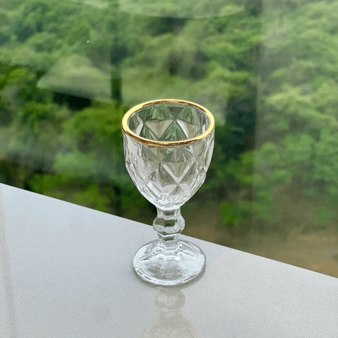 Cada taça possui um design distinto em formato de diamante, acentuado por um delicado fio de ouro, proporcionando uma experiência de degustação única.