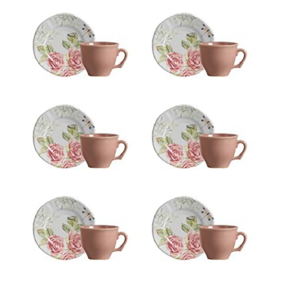 O conjunto completo acompanha 6 xícaras e 6 pires coordenados, oferecendo harmonia e praticidade para o dia a dia.