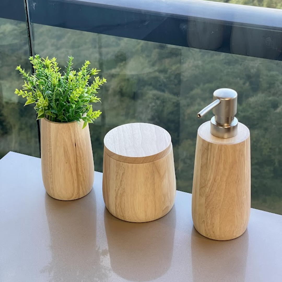 Transforme seu banheiro em um espaço acolhedor e elegante com o Jogo para Banheiro em Madeira 3 Peças.