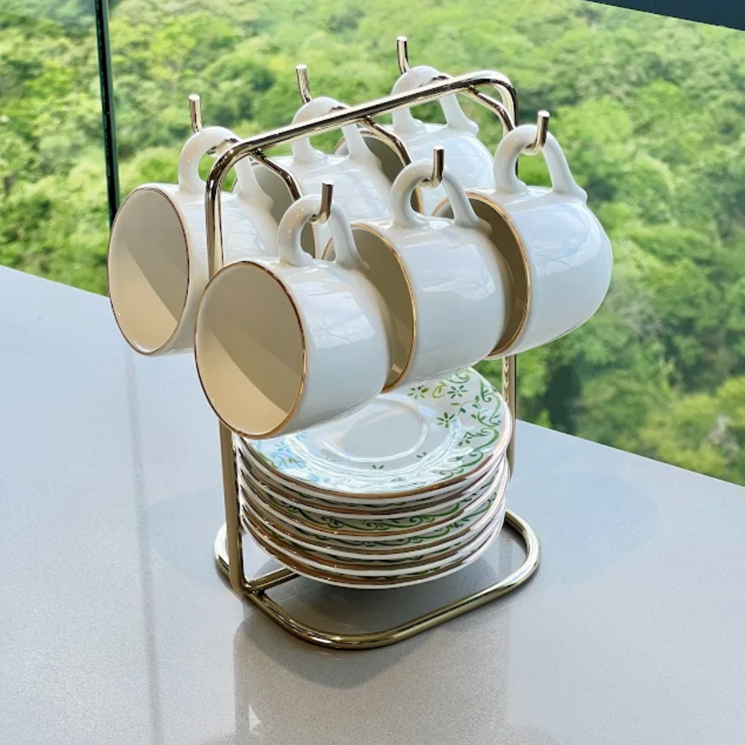 O conjunto inclui 6 xícaras e 6 pires coordenados, tornando cada pausa para o café um momento especial.