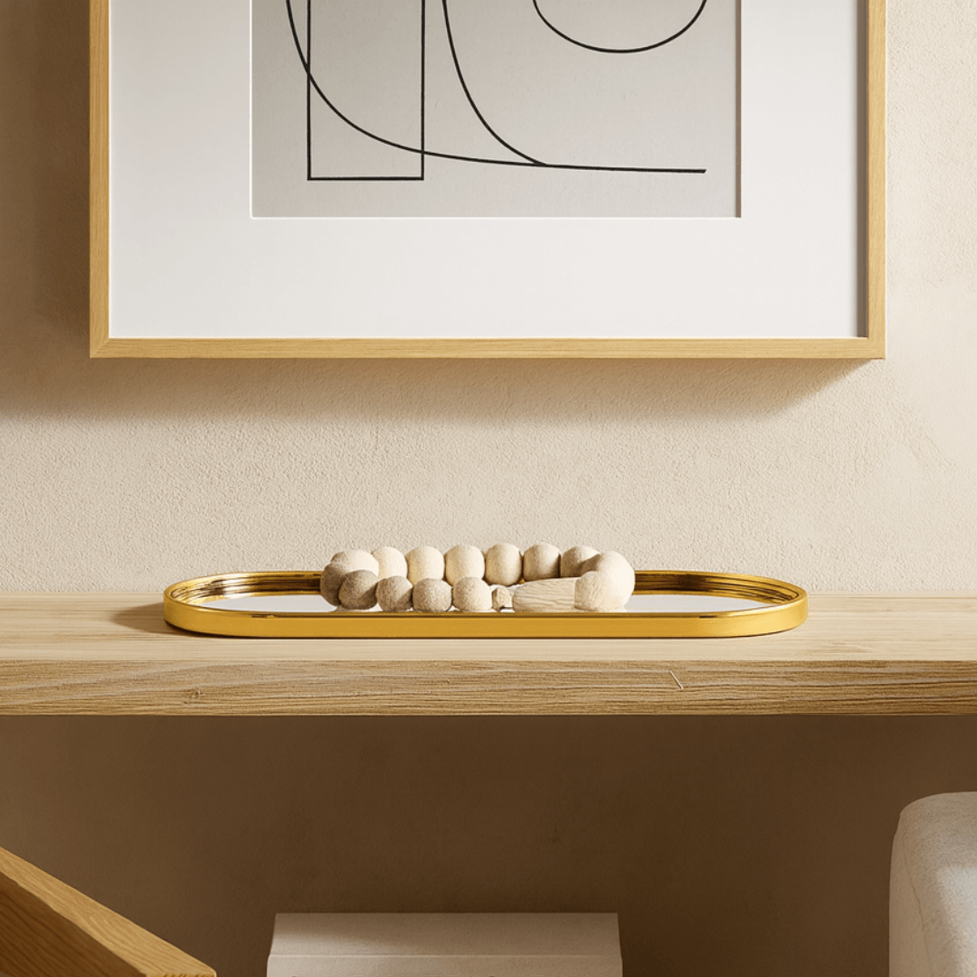 Com formato oval, acabamento dourado sofisticado e base espelhada, ela reflete luz e dá destaque aos objetos que apoia, tornando qualquer ambiente mais charmoso.