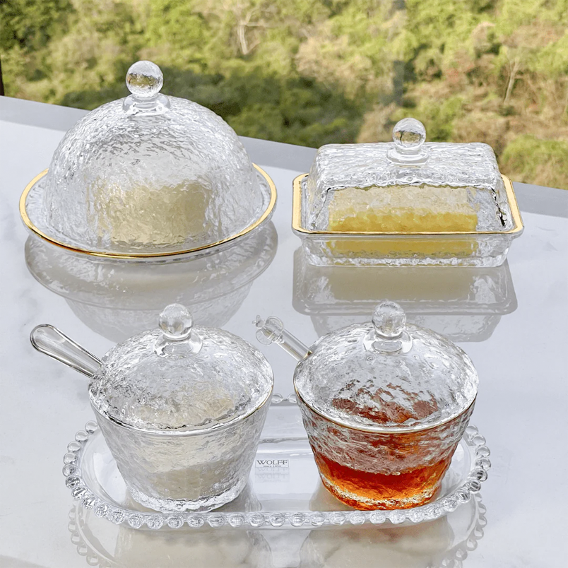 Leve elegância e textura à sua mesa com o Kit para Mesa Posta Cristal Martelado Petra 5 Peças.